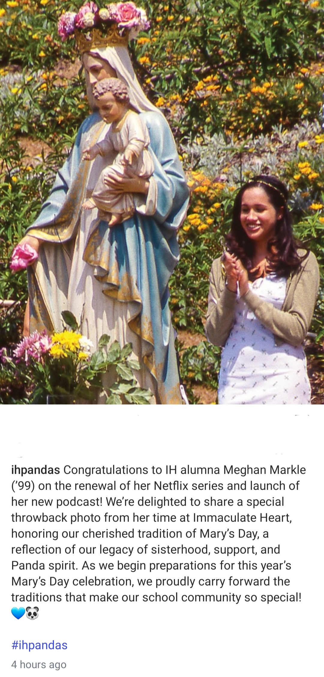 Immaculate Heart High School & Middle School has shared a new photo of Meghan Markle taken when she was a student of the institution. IH shared the photo to congratulate her on her new Netflix show. The photo shows Meghan as a geenager, posing beside a statue of the Blessed Virgin Mary carrying baby Jesus. The caption reads: Congratulations to lH alumna Meghan Markle (’99) on the renewal of her Netflix series and launch of her new podcast! We’re delighted to share a special throwback photo from her time at lmmaculate Heart, honoring our cherished tradition of Mary’s Day, a reflection of our legacy of sisterhood, support, and Panda spirit. As we begin preparations for this year’s Mary’s Day celebration, we proudly carry forward the traditions that make our school community so special!