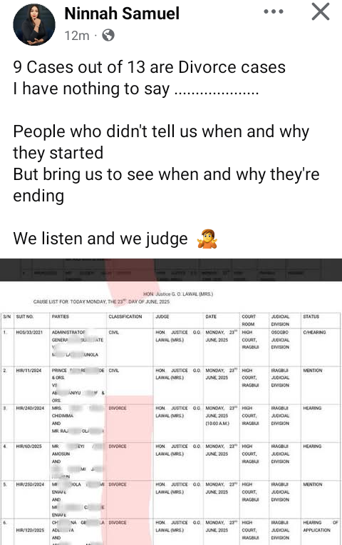 A Nigerian lawyer, Samuel Onyinye Ola, has lamented over the high rate of divorce in the country. She expressed her concern when she posted the cause list for Monday, June 23, 2025 in a High Court. According to the list, 9 cases out of 13 heard in the court on that specific date are divorce matters. A cause list is a scheduled that outlines the cases to be heard on a specific day or specific period, 9 cases out of 13 are divorce cases. I have nothing to say. People who didn’t tell us when and why they started. But bring us to see when and why they are ending. We listen and we judge, she wrote in a Facebook post on Wednesday. These days , all the cases in court are Divorce matters . It’s worrisome but I have nothing to say.