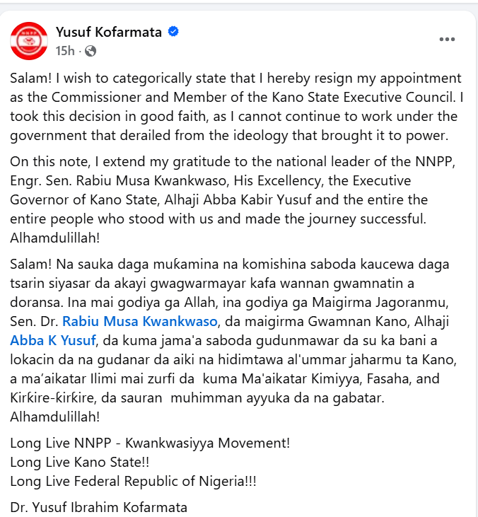 Yusuf Kofarmata, the Kano State Commissioner for Science, Technology and Innovation, has resigned from his position, citing concerns over the direction of the state government.Kofarmata announced his resignation in a statement posted on his Facebook page, where he said he could no longer serve under the current administration. I cannot continue to work under a government that has derailed from the ideology that brought it to power, he said.The former commissioner, who is a member of the New Nigeria Peoples Party (NNPP), said his decision was taken in good faith.