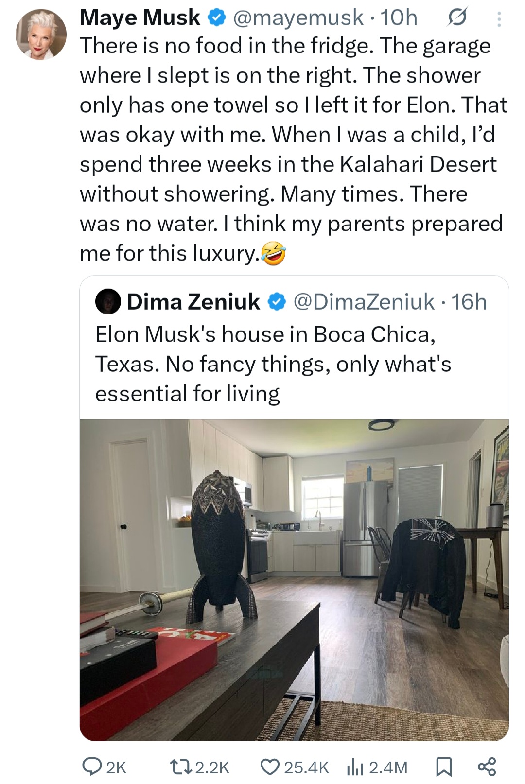 “Elon Musk’s house in Boca Chica, Texas. No fancy things, only what’s essential for living,” the X user wrote. Maye Musk agreed and shared her experience visiting her son’s home. She wrote: “There is no food in the fridge. The garage where I slept is on the right. The shower only has one towel so I left it for Elon. That was okay with me. When I was a child, Id spend three weeks in the Kalahari Desert without showering. Many times. There was no water. I think my parents prepared me for this luxury.”